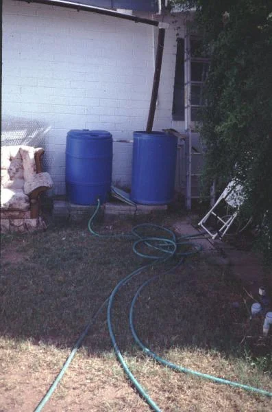 The study also included a household where the washing machine could not be accommodated in a laundry room. Consequently, the owners of the house put the washing machine outside, which is a common arrangement in the older neighborhoods of Tucson. In this particular household, a low-water-using, front-loading washing machine was used. The graywater was collected from the washing machine into a barrel placed beside it. A hose transported the graywater to the vegetable garden of the household (figure 2). This household, according to Little, was of interest to the purpose of the study because the owners had three sources for the graywater they were using. In addition to the washing machine, they incorporated water from the kitchen sink, and also from the bathroom sink and tub. Their three sources of graywater were not mixed together and each source fed a different area of their garden thus allowing the study team to obtain useful and extensive information about graywater reuse.